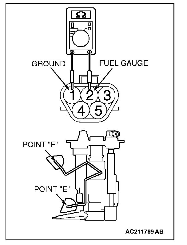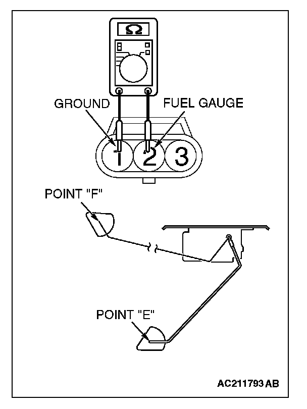 1. Check that resistance value between terminals 2 and 1 is at the standard value when the fuel level sensor float is between point "F" (highest) and point "E" (lowest).