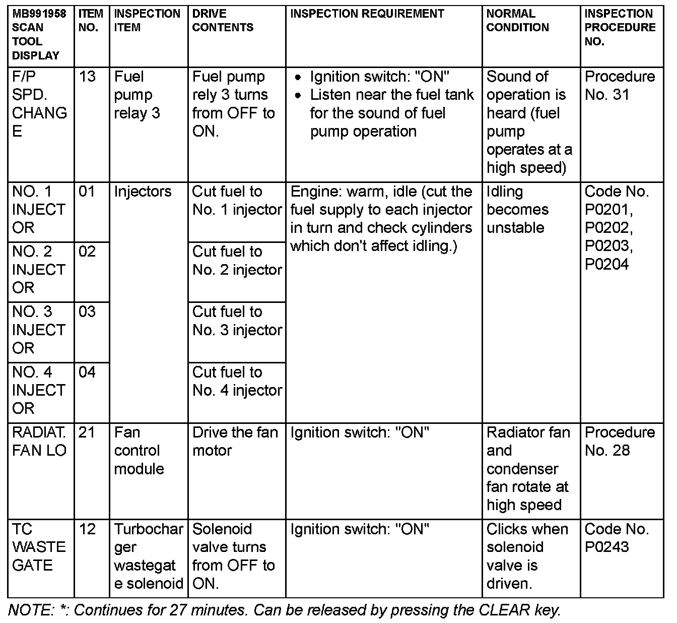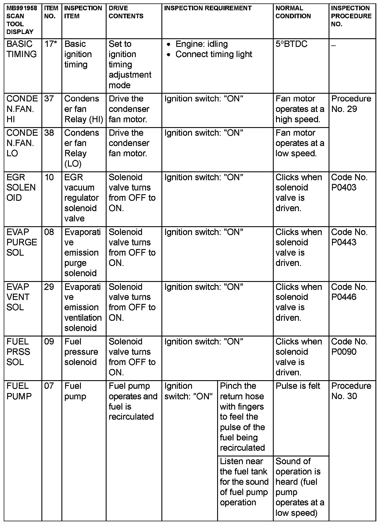 Actuator Test Reference Table