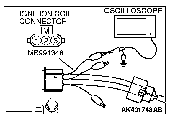 1. Disconnect the ignition coil connector and connect test harness special tool MB991348 in between. (All terminals should be connected.)