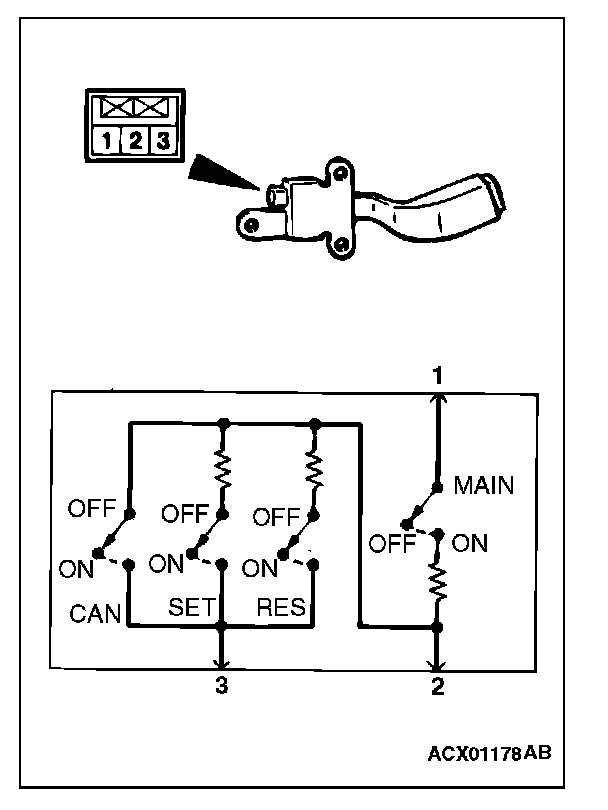 Measure the resistance between the terminals when each of the "COAST/SET", "ACC/RES", "CANCEL" and "CRUISE" (MAIN) switches is pressed. If the values measured at the time correspond to those shown in the table, the resistance values are correct.