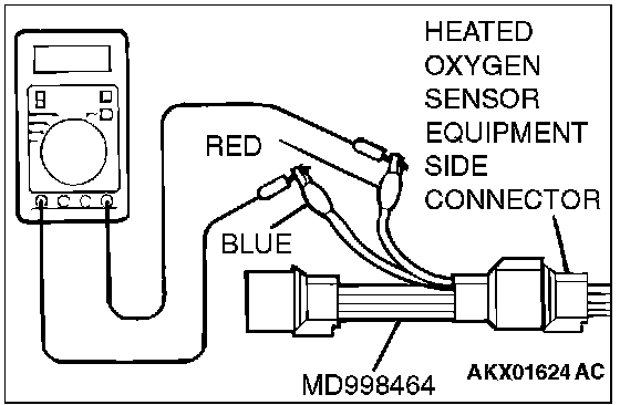1. Disconnect the heated oxygen sensor connector and connect special tool MD998464 to the connector on the heated oxygen sensor side.