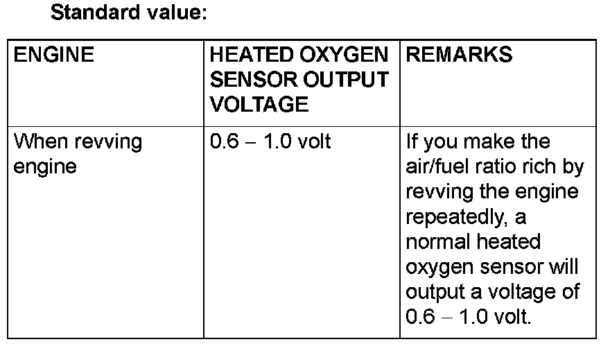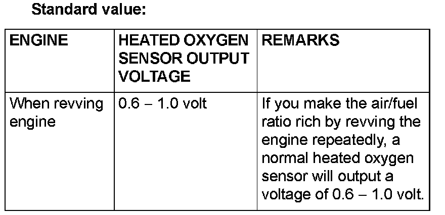 NOTE: If the sufficiently high temperature [of approximate 400°C (752°F) or more] is not reached although the heated oxygen sensor is normal, the output voltage would be possibly low although the rich air/fuel ratio. Therefore, if the output voltage is low, use jumper wires to connect the terminal No.3 and the terminal No.4 of the heated oxygen sensor with a (+) terminal and (-) terminal of 12 volts power supply respectively, then check again.