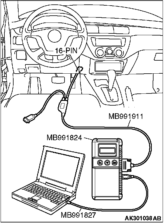 CAUTION: To prevent damage to scan tool MB991958, always turn the ignition switch to the "LOCK" (OFF) position before connecting or disconnecting the scan tool MB991958.