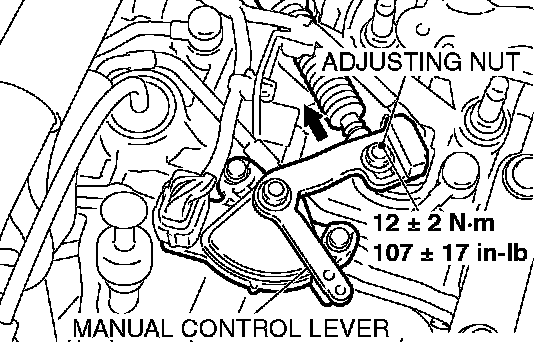 3. Gently push the transaxle control cable in the direction of the arrow, and then tighten the adjusting nut.