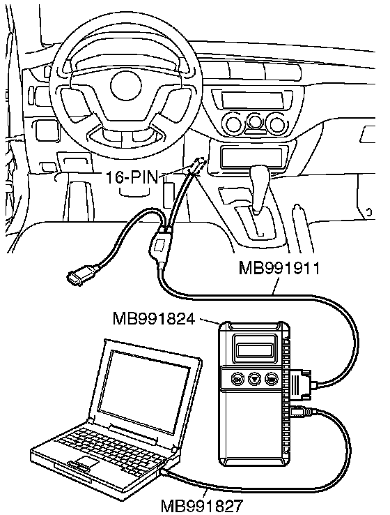 CAUTION: To prevent damage to scan tool MB991958, always turn the ignition switch to the "LOCK" (OFF) position before connecting or disconnecting scan tool MB991958.