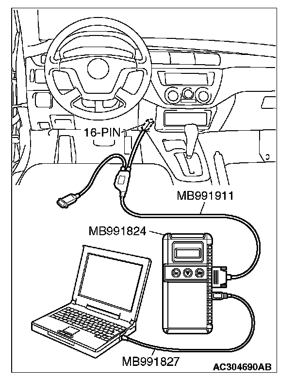 CAUTION: To prevent damage to scan tool MB991958, always turn the ignition switch to the "LOCK" (OFF) position before connecting or disconnecting scan tool MB991958.