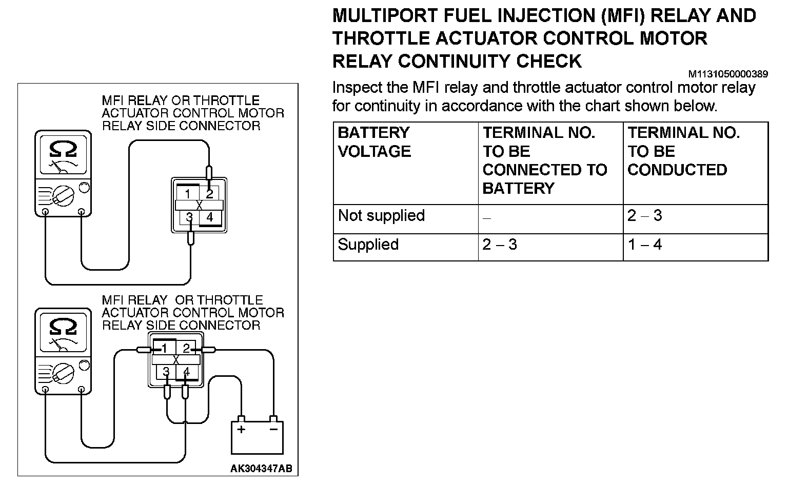 Multiport Fuel Injection (MFI) Relay And Throttle Actuator Control Motor Relay Continuity Check: