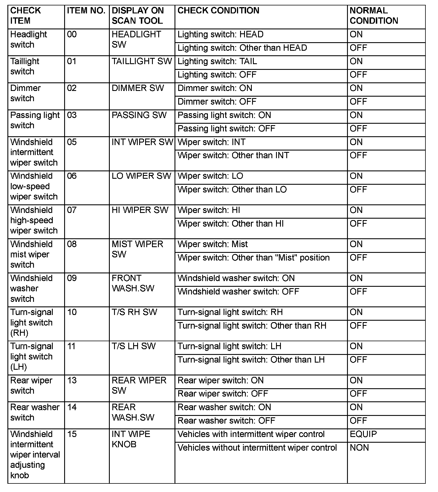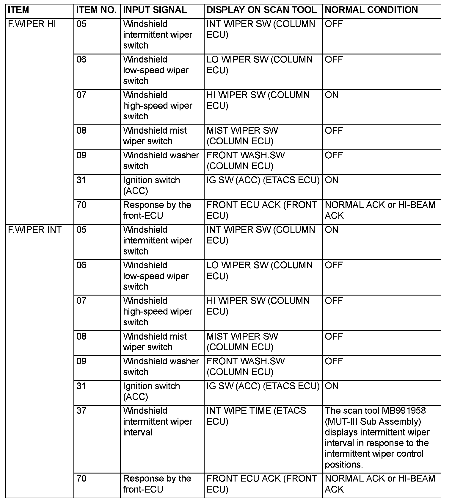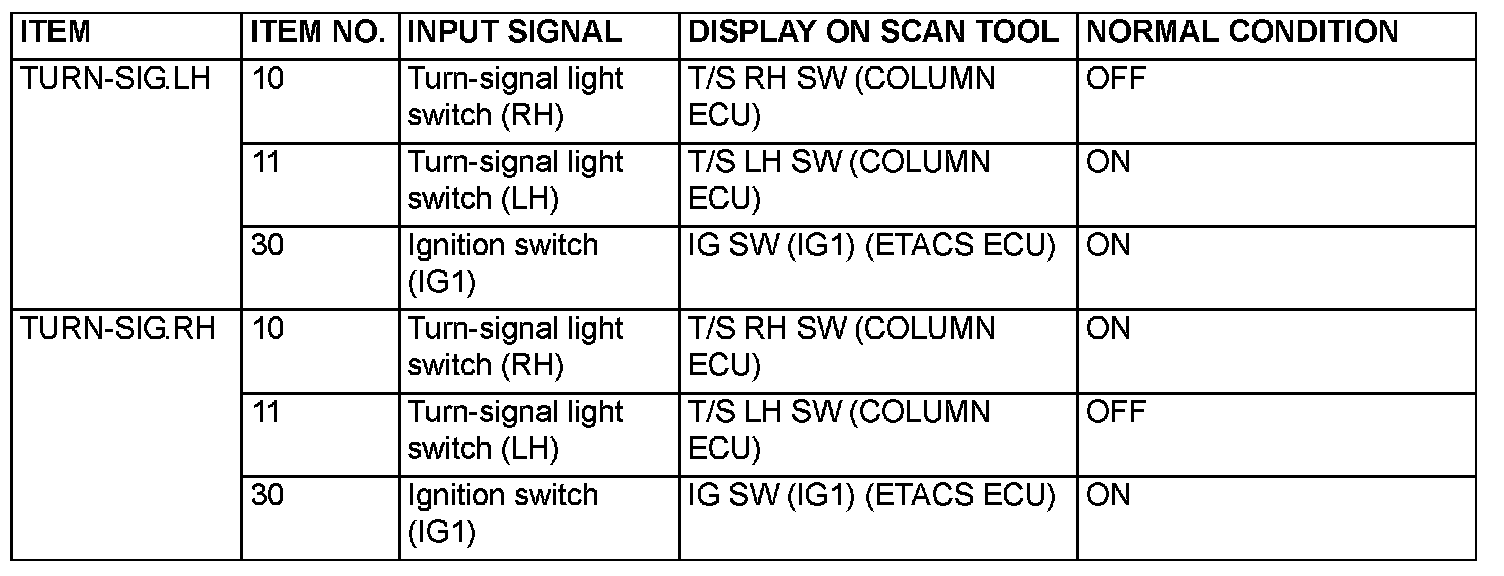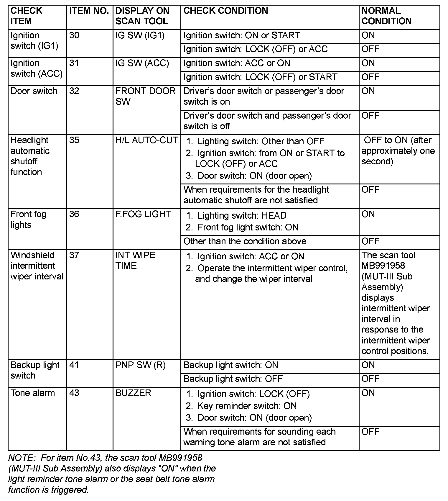 1. The following input signals can be checked by using the scan tool MB991958 (MUT-III Sub Assembly) and the SWS monitor kit.