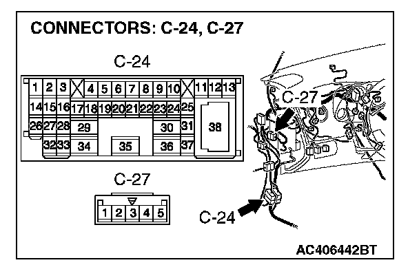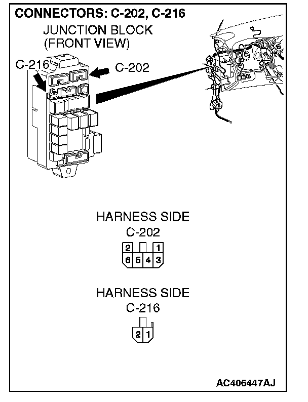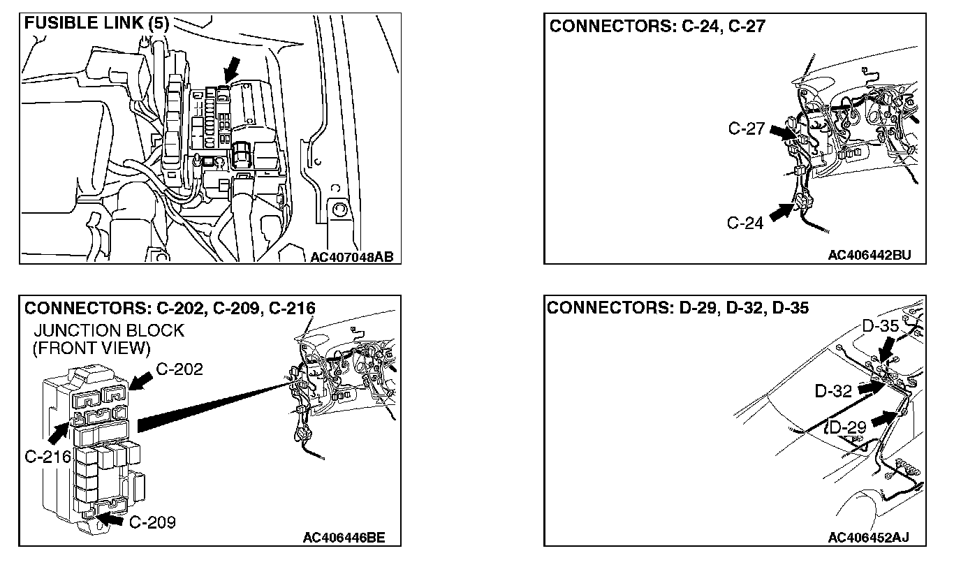 NOTE: Also check junction block connectors C-202, C-216, intermediate connector C-24, C-27 and D-29 for loose, corroded, or damaged terminals, or terminals pushed back in the connector. If junction block connector C-202, C-216, intermediate connector C-24, C-27 or D-29 is damaged, repair or replace the damaged component(s) as described in Harness Connector Inspection.