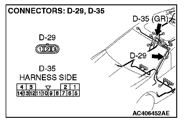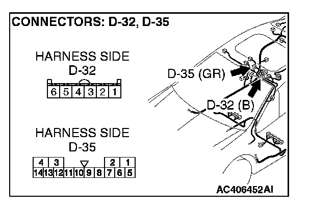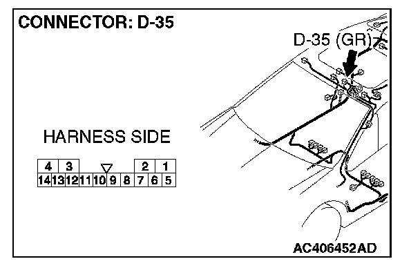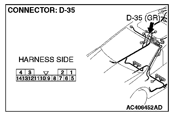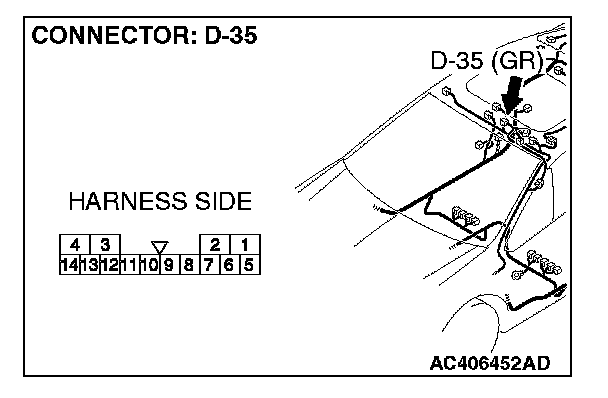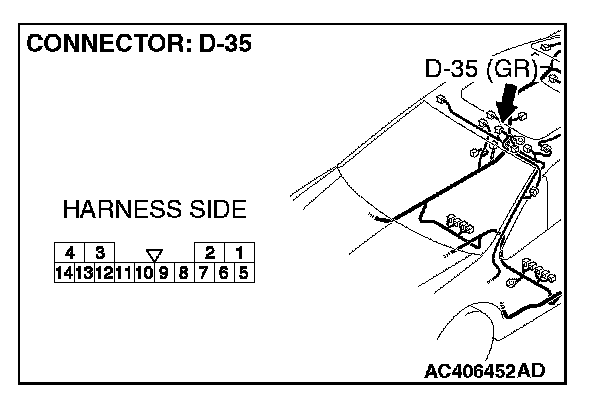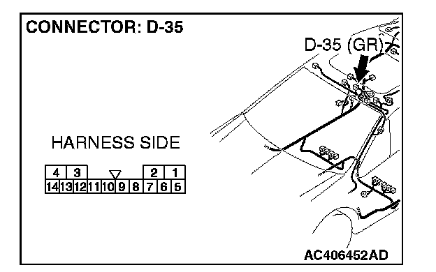 STEP 1. Check sunroof motor assembly connector D-35 for loose, corroded or damaged terminals, or terminals pushed back in the connector.