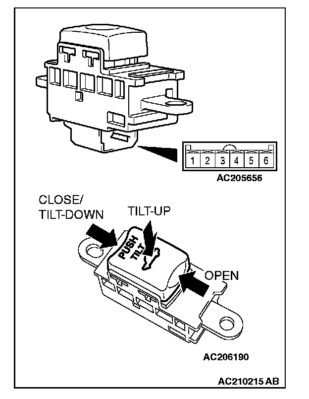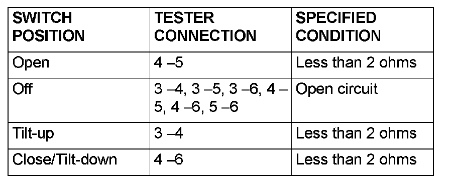 Check continuity when the sunroof switch is operated to "OPEN", "TILT UP" or "CLOSE/TILT DOWN" positions. Refer to Sunroof Assembly in Sunroof/Moonroof.