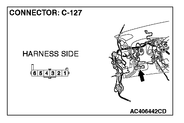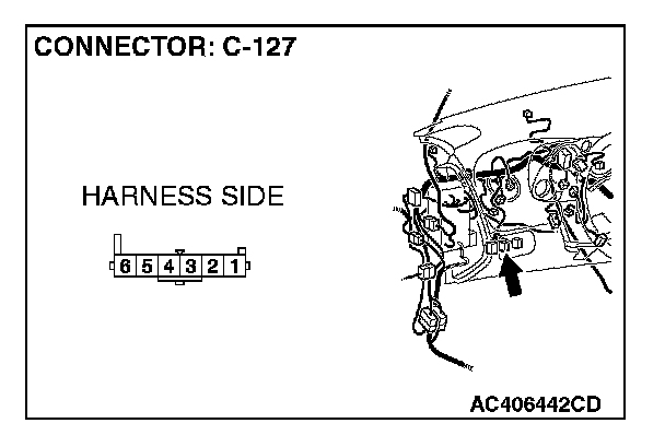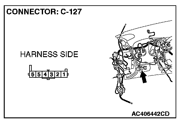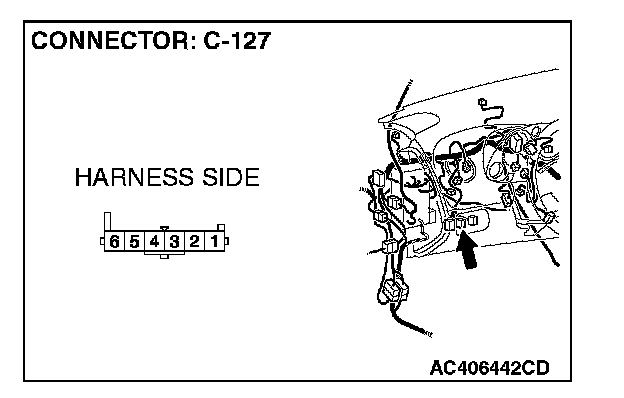 1. Disconnect front fog light switch connector C-127 and measure the resistance available at the wiring harness side of the connector.