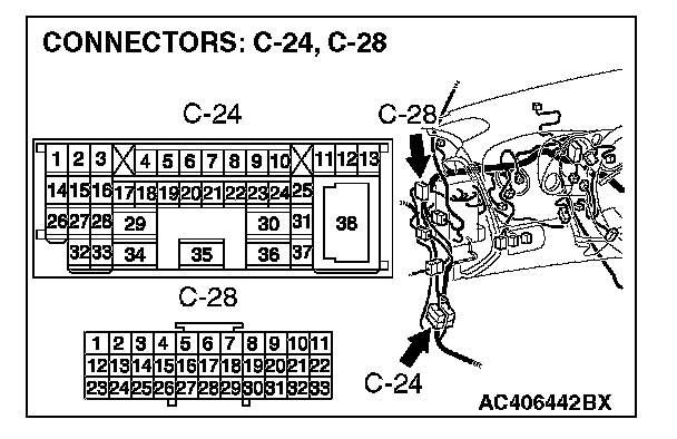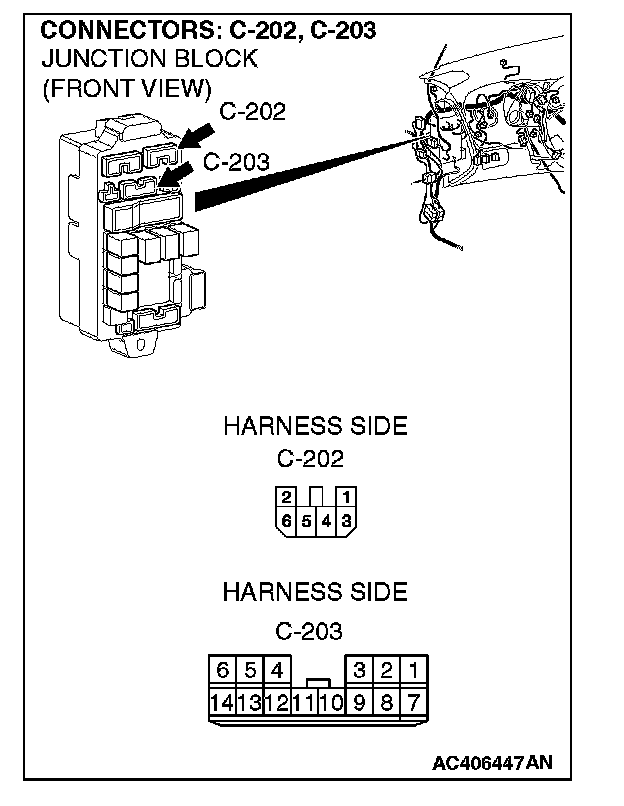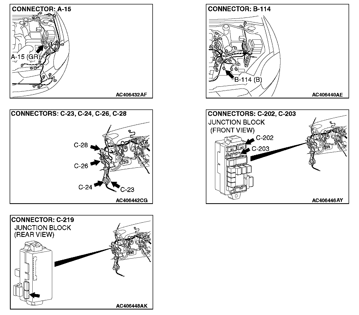 NOTE: Also check junction block connectors C-202, C-203, joint connector C-28, intermediate connectors A-15 and C-24 for loose, corroded, or damaged terminals, or terminals pushed back in the connector. If junction block connectors C-202, C-203, joint connector C-28, intermediate connectors A-15 or C-24 are damaged, Repair or replace the damaged compo-nent(s) as described in Harness Connector Inspection.