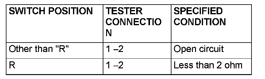 If the signal is not normal, the rear wiper does not operate consecutively twice when the shift lever is moved to the "R" position with the rear wiper on. If the signal is not normal, the backup light switch or the ETACS-ECU may be defective.