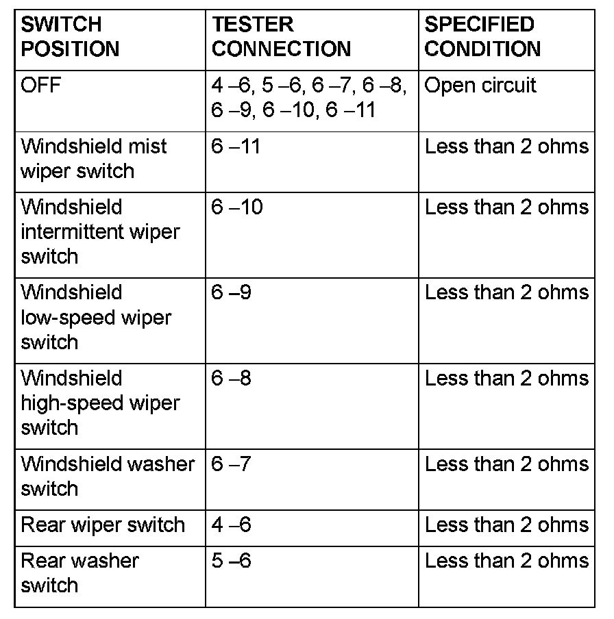 Remove the wiper and washer switch. Then check continuity between the switch terminals.