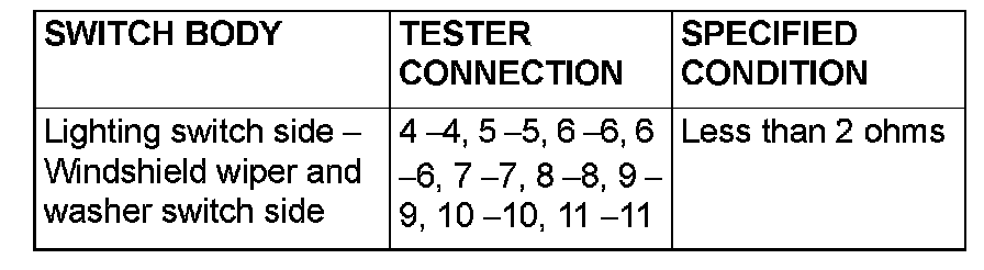 Remove the turn-signal light and lighting switch and windshield wiper and washer switch. Then check continuity between the switch body terminals.