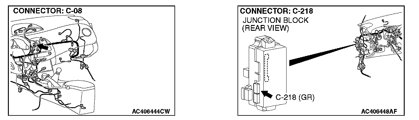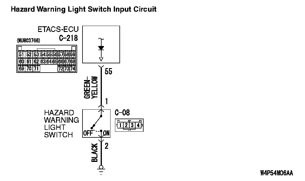STEP 6. Check the wiring harness between hazard warning light switch connector C-08 (terminal 1) and ETACS-ECU connector C-218 (terminal 55).