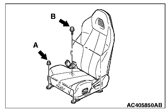 1. Temporarily tighten the nuts in mounting locations shown in the illustration with no weight on the front seat cushion and check the operation of the seat slide.