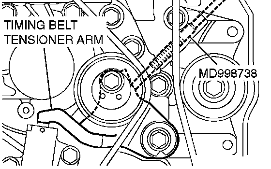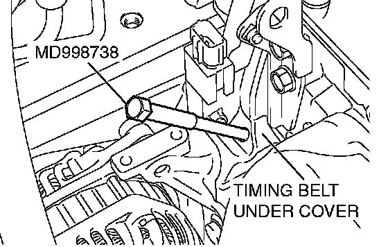 3. Screw in special tool MD998738 until it contacts the timing belt tensioner arm.