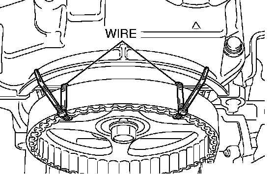 4. Secure the camshaft sprocket and valve timing belt with wire to prevent slippage between the camshaft sprocket and valve timing belt.