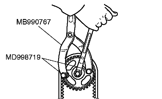 1. Hold the camshaft sprocket with special tools MB990767 and MD998719 in the same manner as removal.