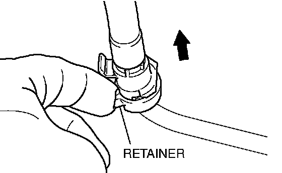 2. Pull up the retainer and remove the fuel high-pressure hose in the direction shown.