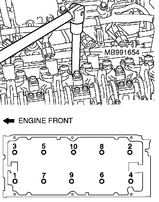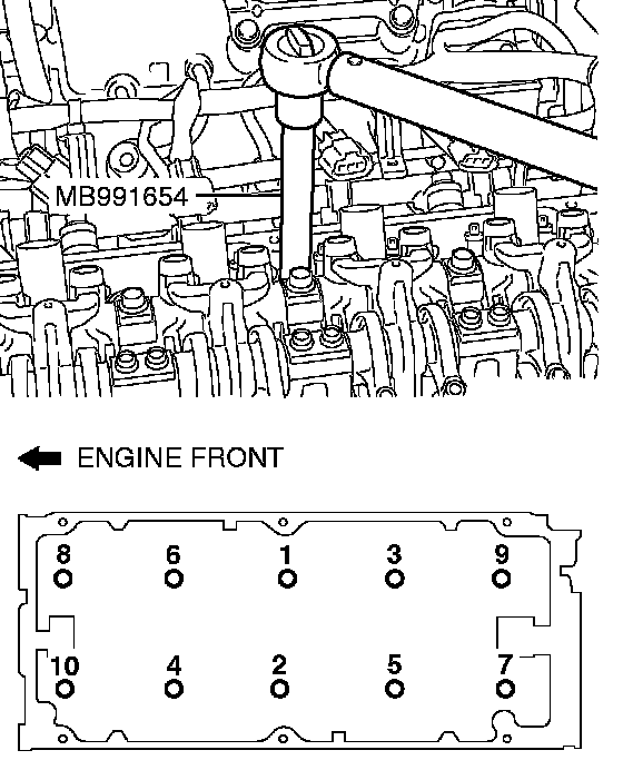 Use special tool MB991654 to loosen the cylinder head bolts in two or three steps in the order shown in the illustration. If the cylinder head bolts cannot be pulled out due to the washer being trapped in the valve spring, raise the bolt slightly, then remove it while holding it with a magnet.