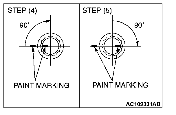 5. Apply a paint mark to the heads of the cylinder head bolts and cylinder head, then tighten 90 degrees as shown.