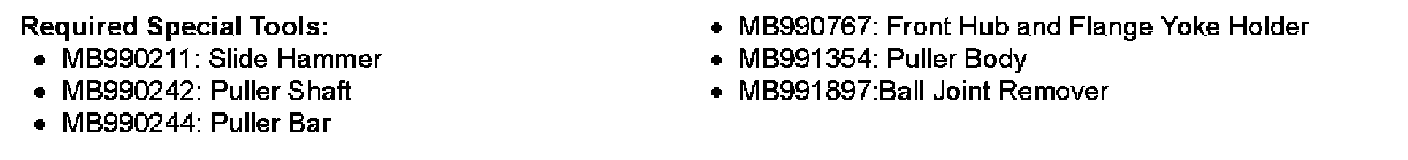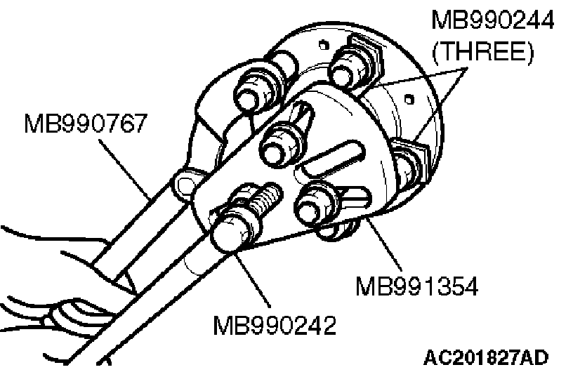 2. If it is difficult to push out the drive shaft by hand, use special tools MB990242, MB990244, MB991354 and MB990767 to push out the drive shaft from the hub and knuckle.
