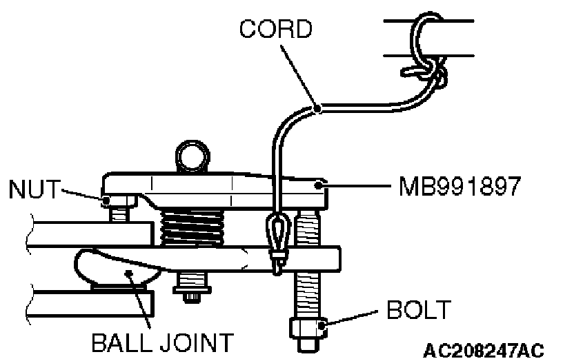 1. Replace the self locking nut for lower arm ball joint with a regular nut, because the original one is a little bit large to install the special tool. Install special tool MB991897 as shown in the figure.