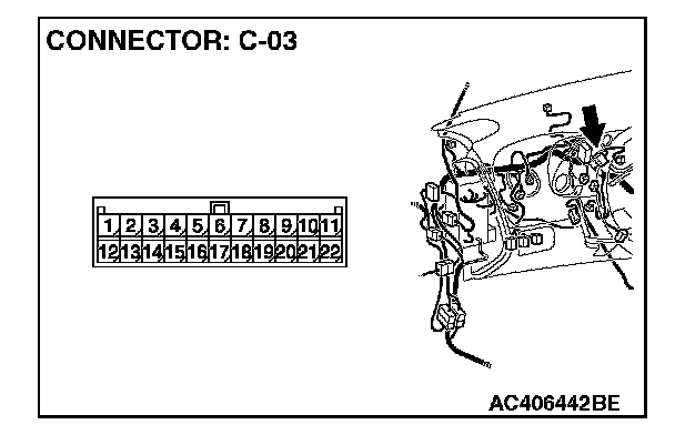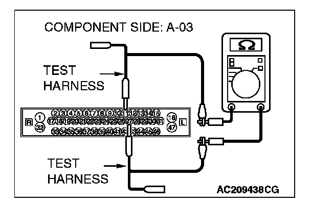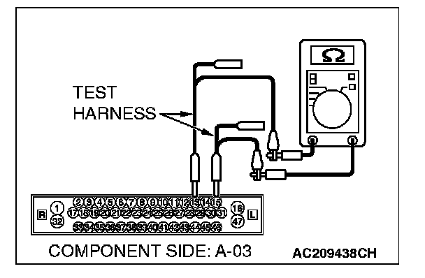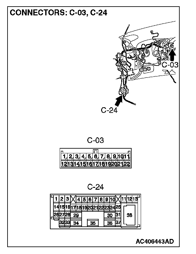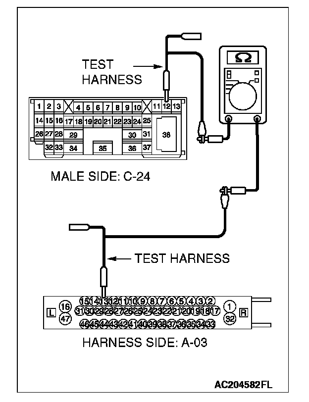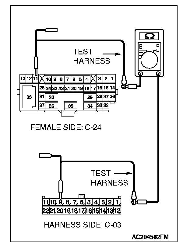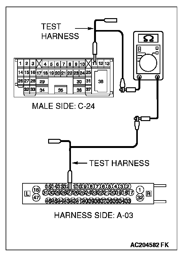 1. Disconnect intermediate connector C-24 and joint connector (3) C-03, and measure the resistance between the wiring harness side connector of joint connector (3) C-03 and the male side connector of intermediate connector C-24 (at front wiring harness side).