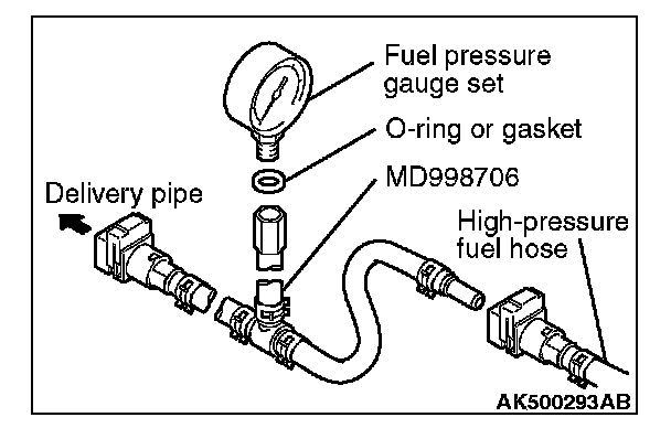 1. Via a gasket, install the special tool MB991637 (fuel pressure gauge set) into the special tool that has already assembled as described.