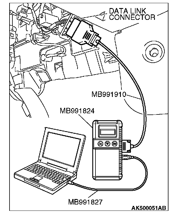 CAUTION: To prevent damage to scan tool MB991958, always turn the ignition switch to the "LOCK" (OFF) position before connecting or disconnecting scan tool MB991958.