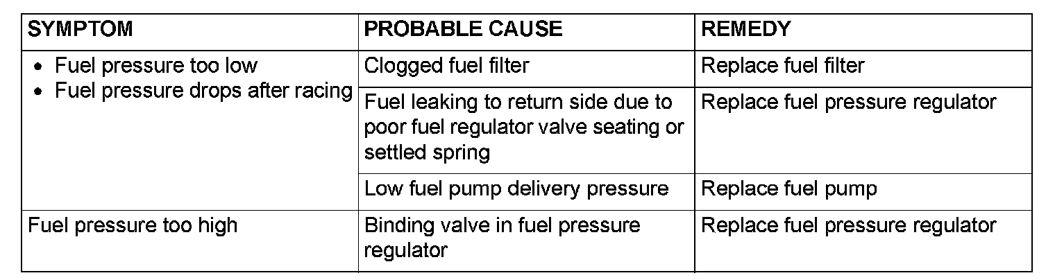 13. If any of fuel pressure measured in steps 11 to 12 is out of specification, troubleshoot and repair according to the table below.