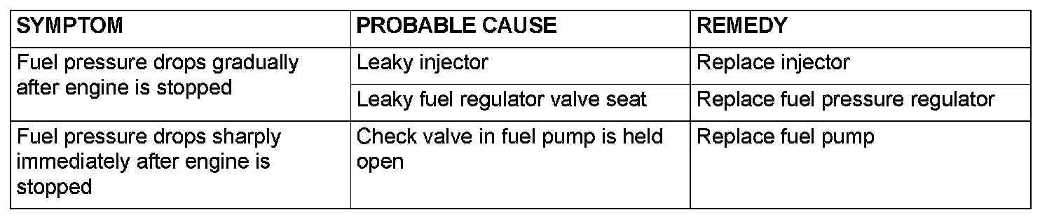 14. Stop the engine and observe fuel pressure gauge reading. It is normal if the reading does not drop within two minutes. If it does, observe the rate of drop and troubleshoot and repair according to the table below. Start, then stop the engine.