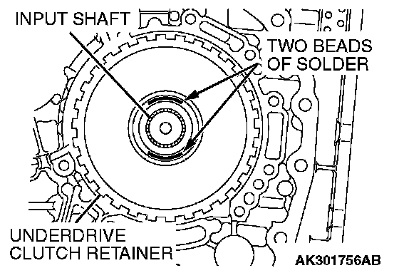57. Place two beads of solder [each 10 mm (0.39 inch) in length, 3.5 mm (0.14 inch) in diameter] on the underdrive clutch retainer as shown in the illustration.
