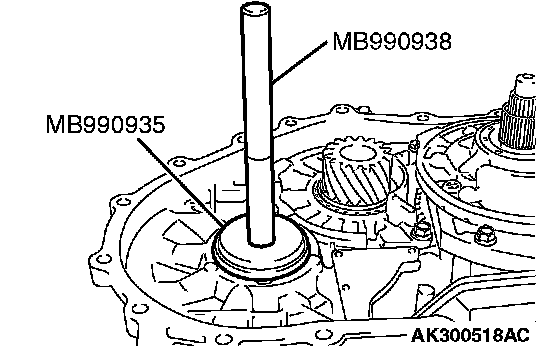71. Use special tools MB990935 and MB990938 to tap the differential bearing outer race in the transaxle case.