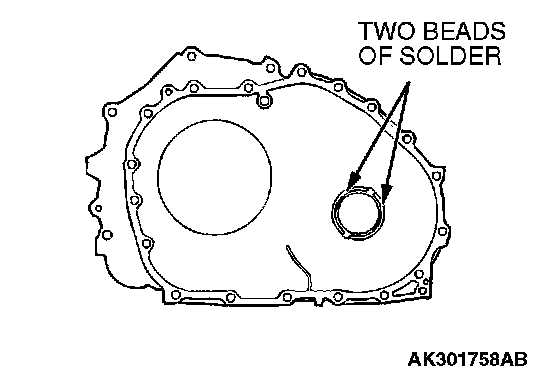 73. Place two beads of solder [each 10 mm (0.39 inch) in length, 3 mm (0.12 inch) in diameter] on the torque converter housing as shown in the illustration.