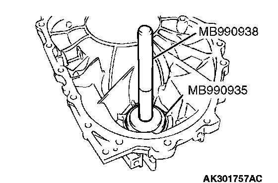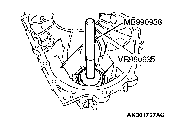 74. Use special tools MB990935 and MB990938 to press the differential bearing outer race into the torque converter housing.