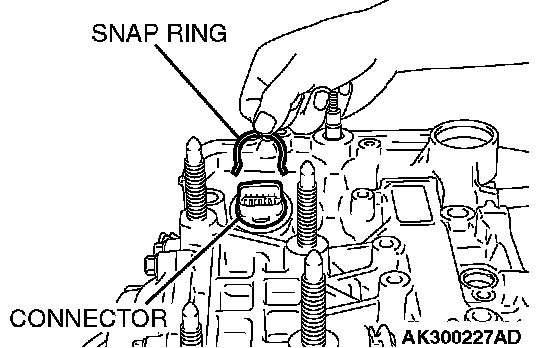 90. Insert the solenoid valve harness connector into the hole from the inside of the transaxle case so it is oriented as shown in the illustration. Then secure the snap ring to the connector groove.