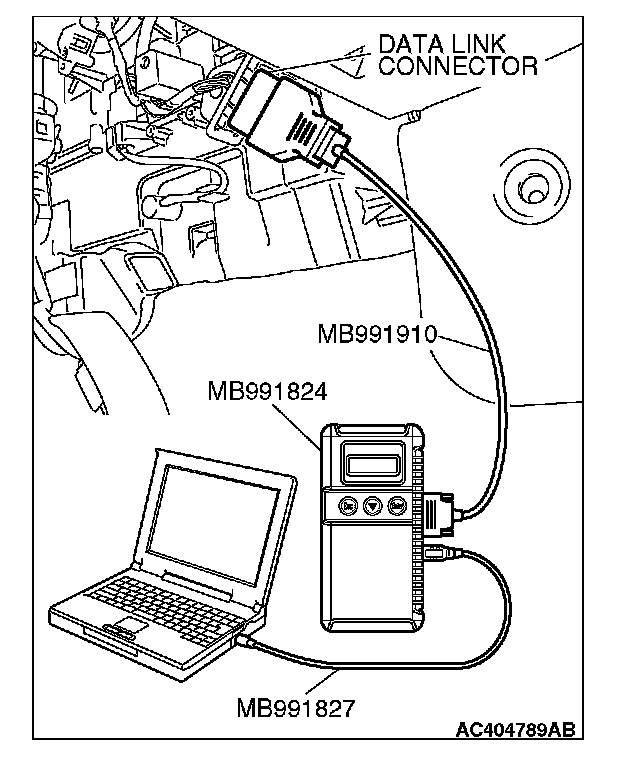 NOTE: Disconnecting scan tool MB991958 is the reverse of the connecting sequence, making sure that the ignition switch is at the "LOCK" (OFF) position.