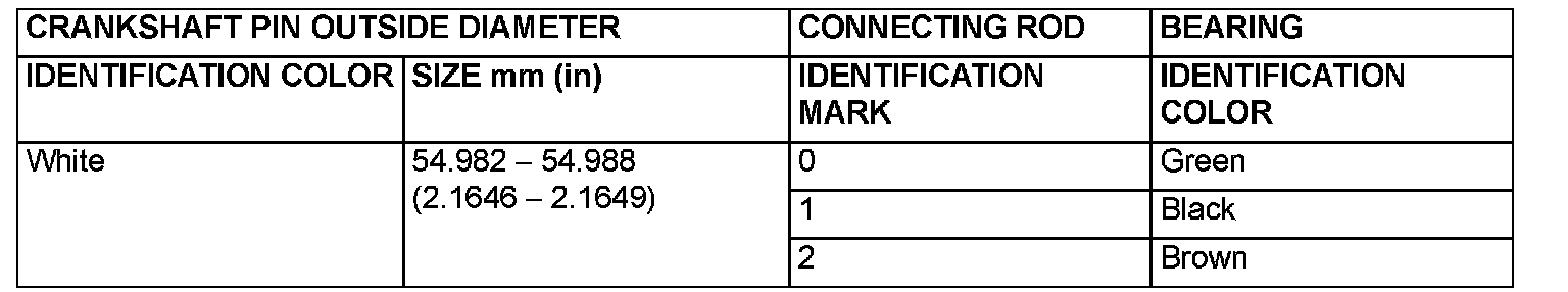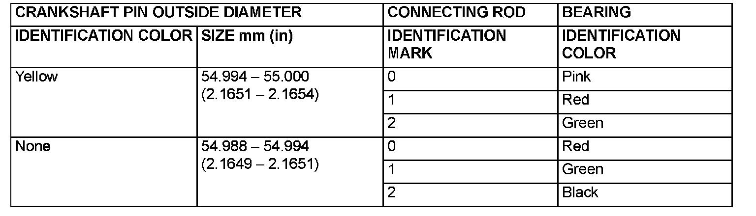 Connecting Rod BearingMeasure the crankshaft pin diameter and confirm its classification from the following table. In the case of a crankshaft supplied as a service part, identification colors/marks of its pins are painted/stamped at the positions shown in the illustration.