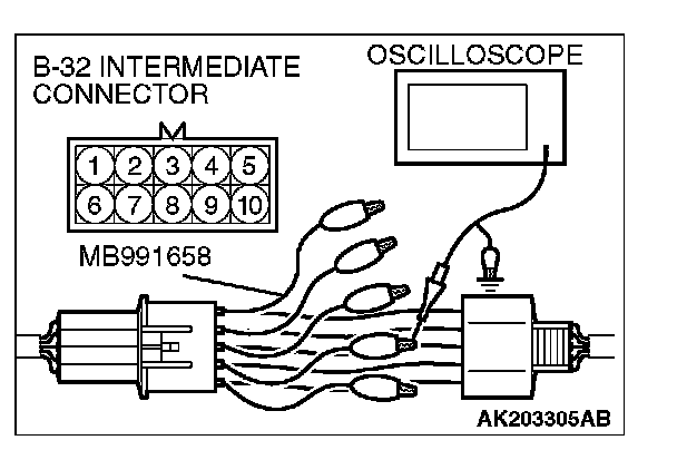 2. Connect the oscilloscope probe to each intermediate connector B-32 terminal to analyze each cylinder: