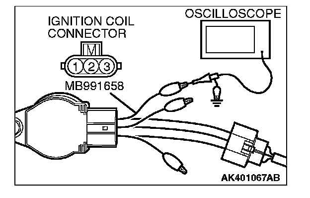 1. Disconnect the ignition coil connector, and connect test harness special tool (MB991658) between the separated connector. (All terminals should be connected.)