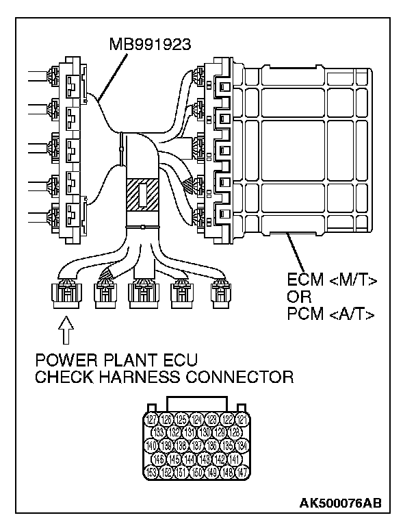 1. Disconnect the intermediate connector B-32, and connect the test harness special tool (MB991658) between the separated connector.
