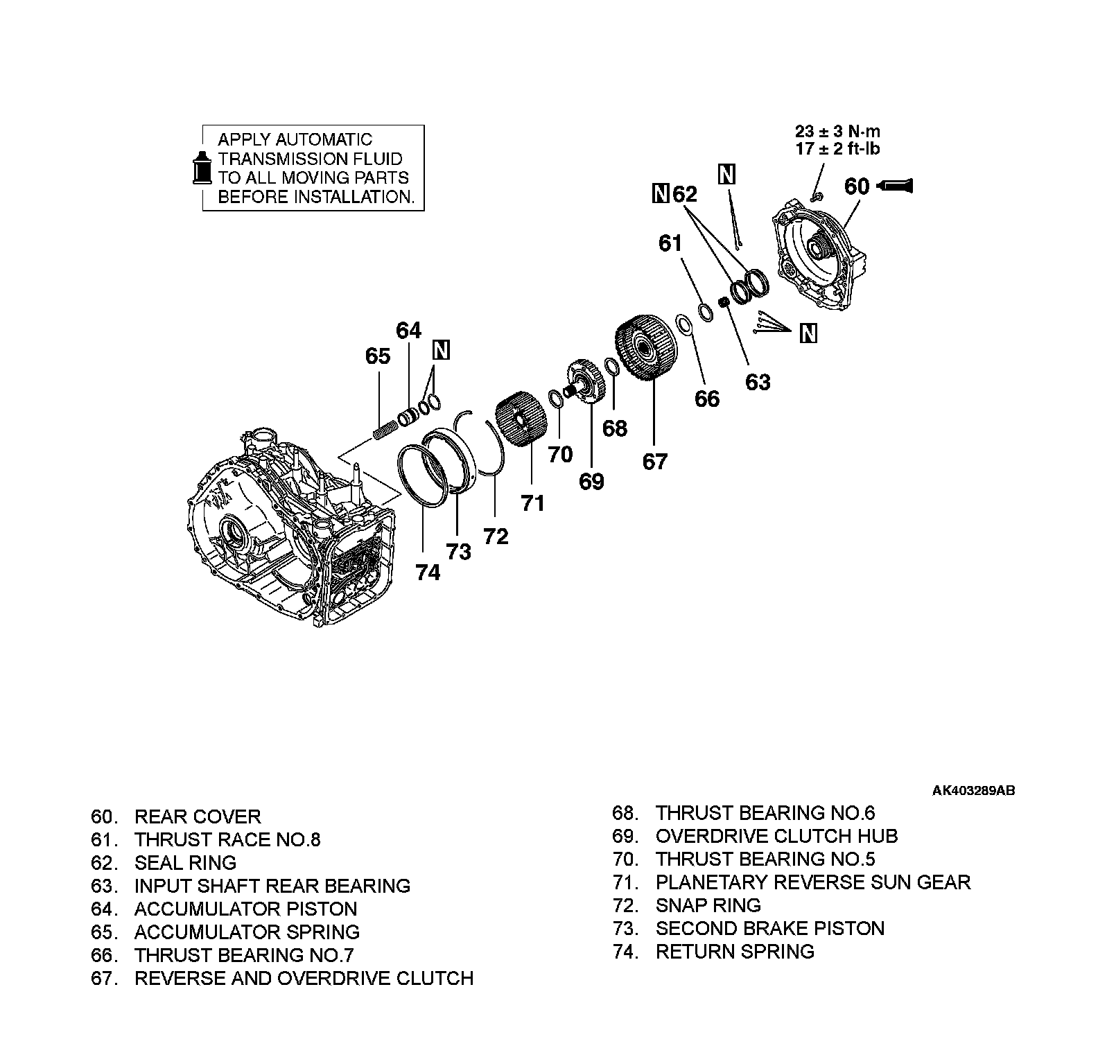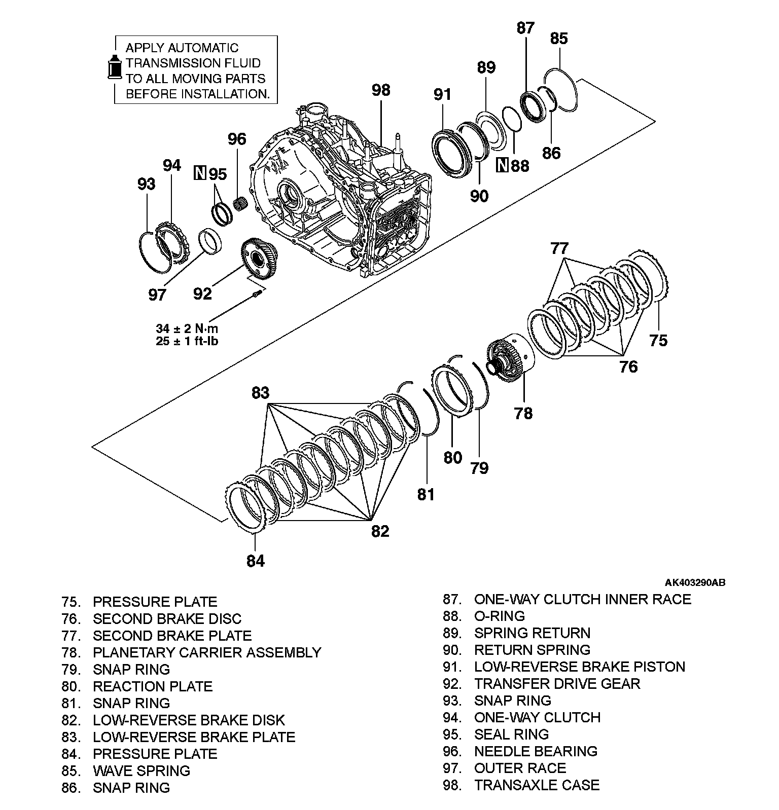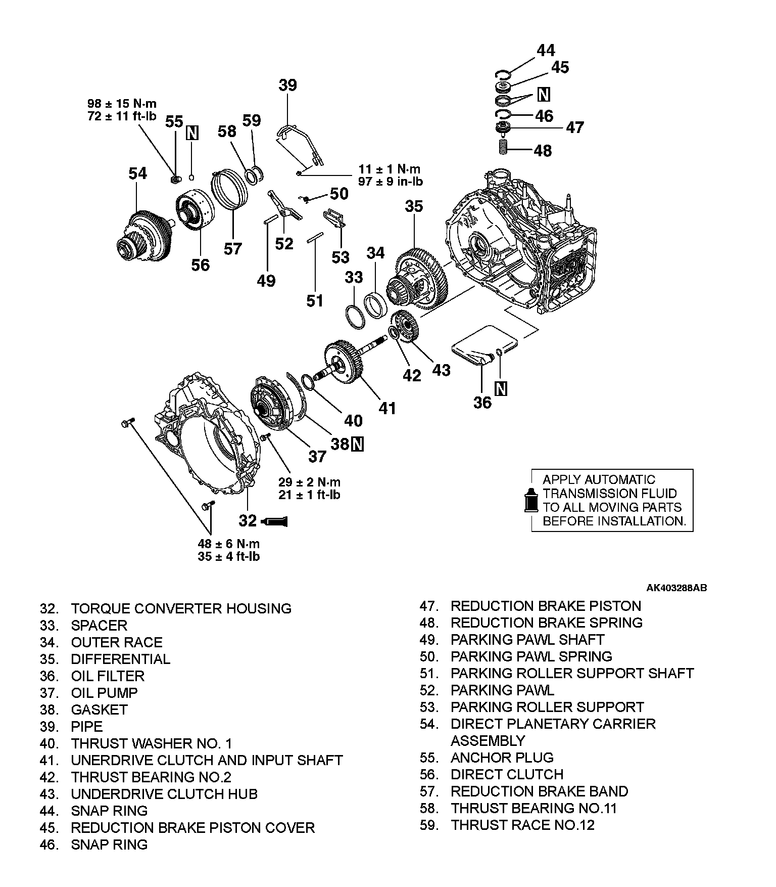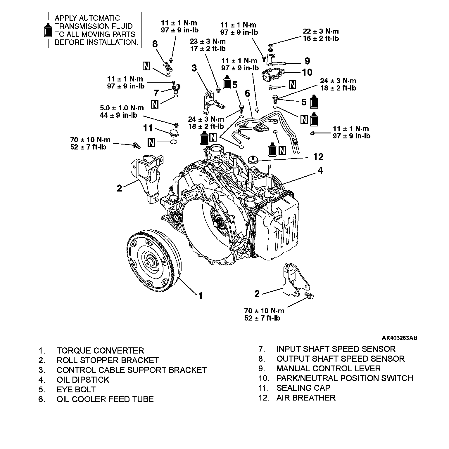 ^ Apply ATF to friction components, rotating parts, and sliding parts before installation. Immerse new clutch discs or brake discs in ATF for at least two hours before assembling them.