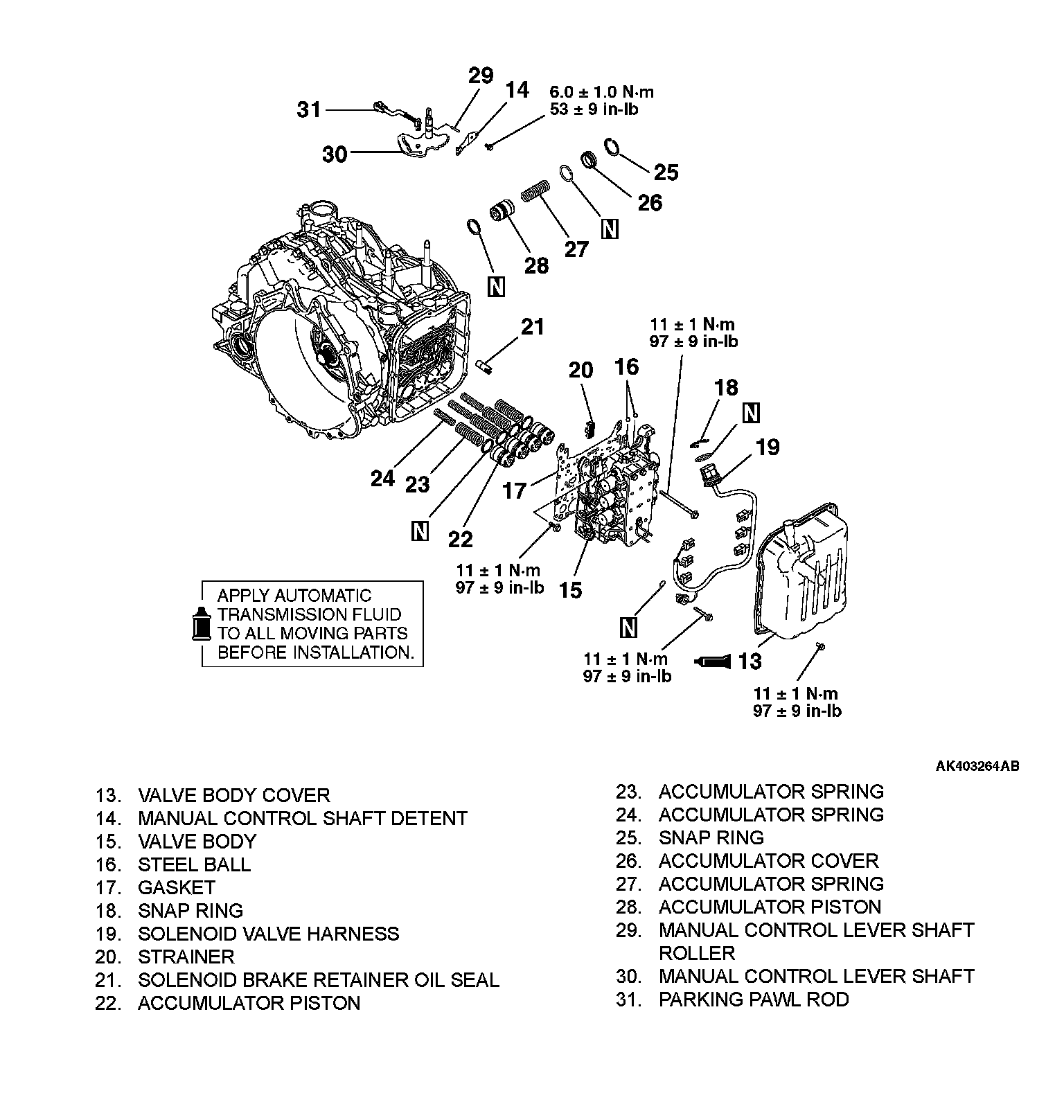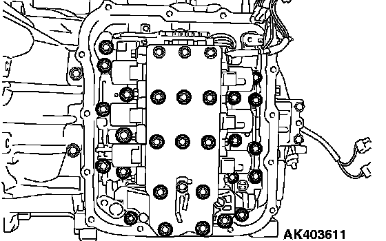 96. Install the valve body mounting bolts (twenty seven pieces), and tighten to the specified torque.