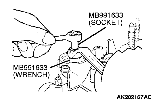 3. Using a torque wrench fitted with the socket of the special tool, tighten the adjusting rod to 10 Nm (89 inch lbs.), then loosen it. Repeat this operation twice. Tighten the adjusting rod to 5 Nm (43 inch lbs.), then turn it back 5 - 1/2 (180 degrees) to 5 - 3/4 (270 degrees) turns.