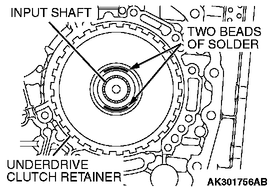 59. Place two beads of solder [each 10 mm (0.39 inch) in length, 3.5 mm (0.14 inch) in diameter] on the underdrive clutch retainer as shown in the illustration.