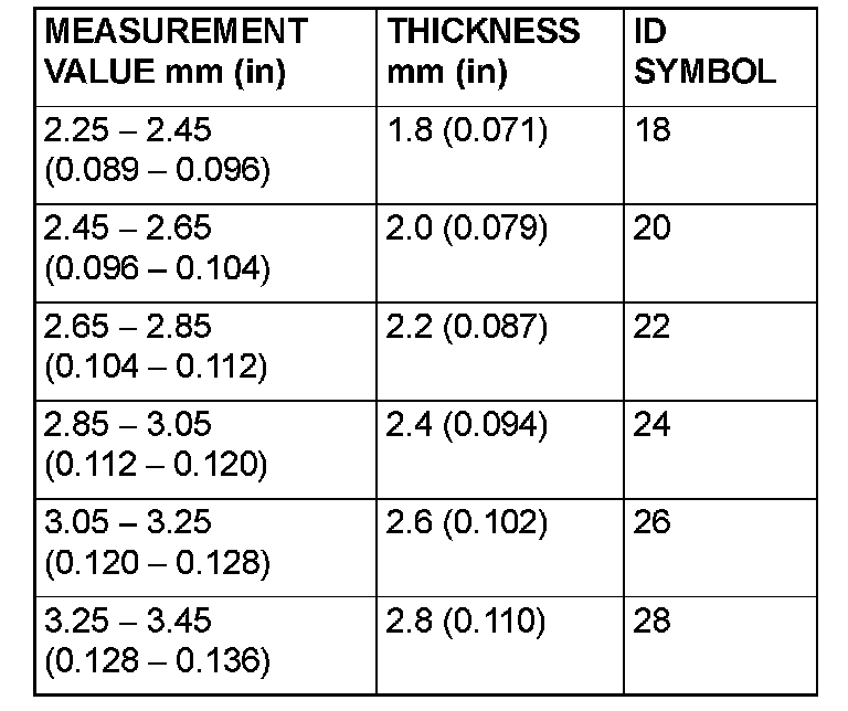 79. Use a micrometer to measure the thickness of the crushed solder beads and record the measured value. Add 0.045 to 0.105 mm (0.0018 to 0.0041 inch)* to the measured value and select a spacer with the corresponding thickness. Select the most suitable one from among those listed. Adjusting Plate, Snap Ring and Spacers